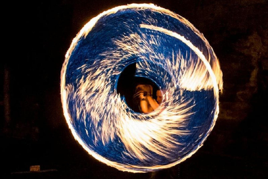 Beherrscht und geführt, gedreht, geworfen, gespuckt, geschwungen und jongliert beugt sich das Feuer und tut nur das, was wir wollen.